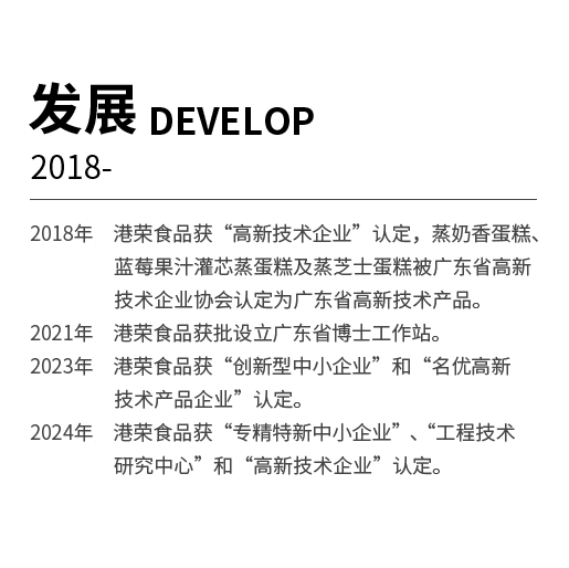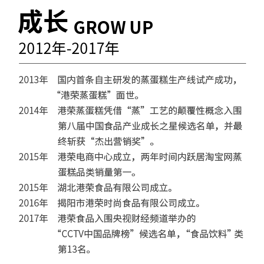 作為率先在國內研發出蒸蛋糕的品牌,港榮食品深信產品是企業的根本,一直以來也致力于產品研發和技術創新。以此推出了以蒸奶香蛋糕為首的蒸系列蛋糕,更創新性地推出了下蒸上烤的蒸芝士蛋糕。“誠信、健康、創新、時尚”是港榮的經營理念,也會繼續努力為廣大消費者提供更優質的食品。